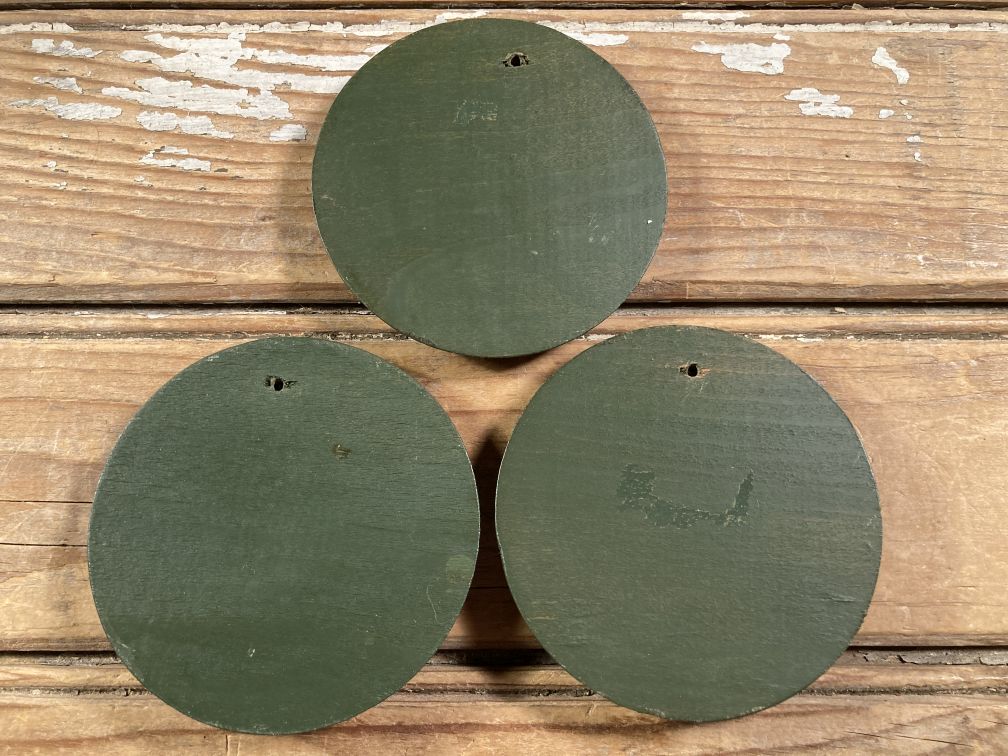- Set of 3 miniature wood wall plaques in very good condition with light wear and tear; no damage. No hanging hardware--only a nail hole in each plaque.