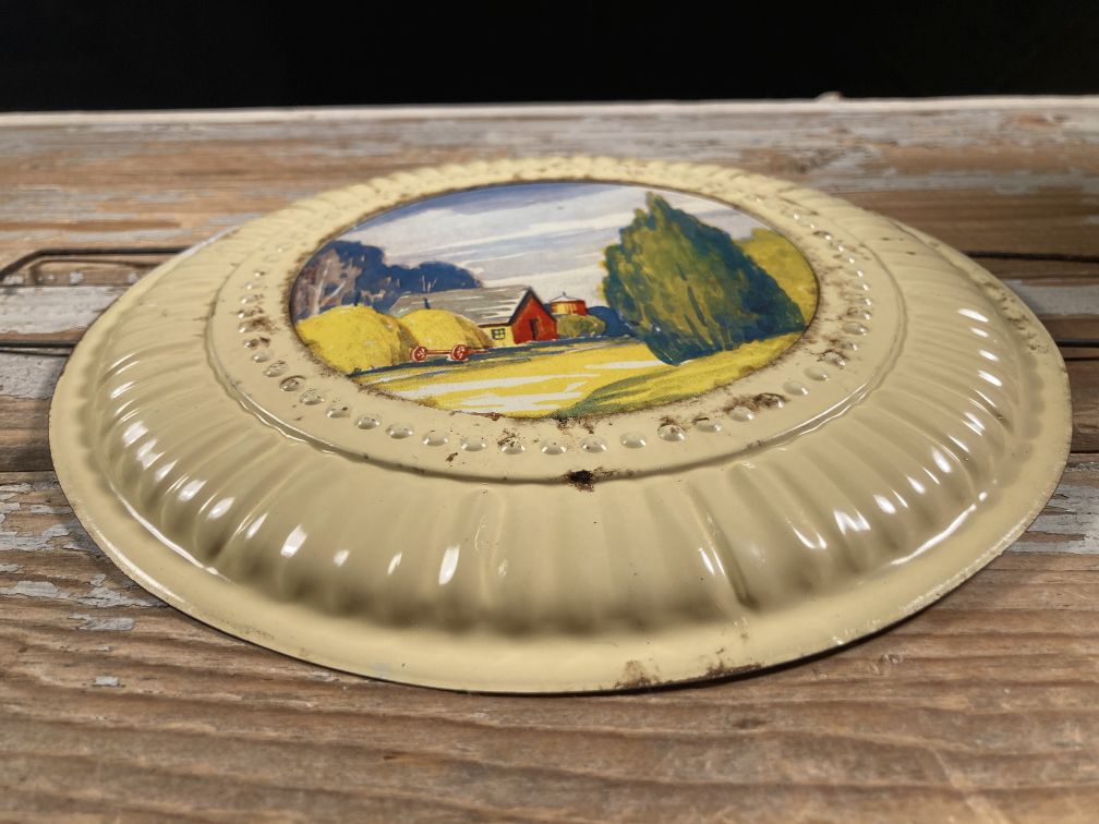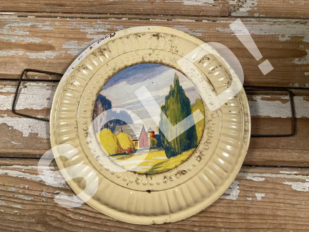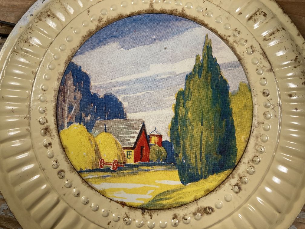 - Vintage Metal Flue Cover Hand-Painted Farm Barn Scene Spring Clips 8.25-in 1950s