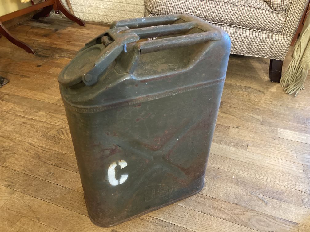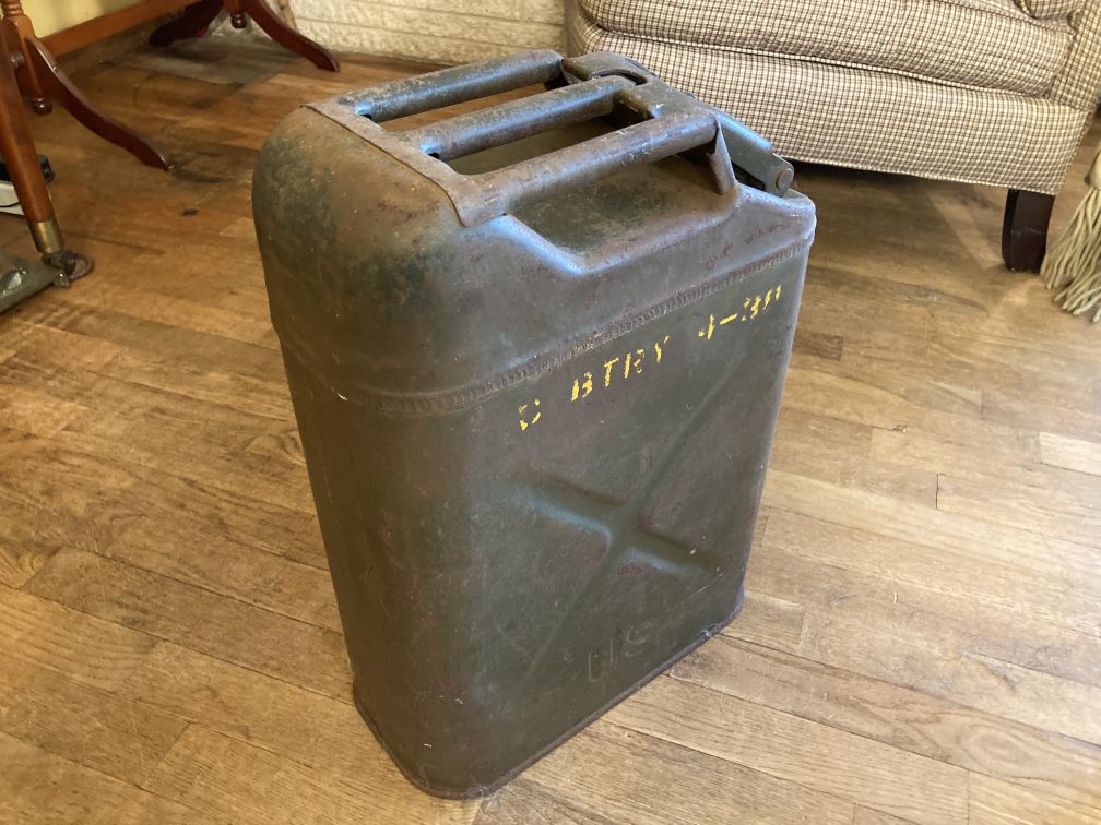 • Vintage metal military gas can in good condition with wear and tear from age and use.  Surface rust and paint wear throughout; pocked enamel inside; bumps, dents, dings, and scratches throughout; no rust holes.  Gas can still intact and appears operable.  This vintage metal military gas can is painted army green, complete with markings, stampings, and stencils which inform of it's manufacture and military unit.