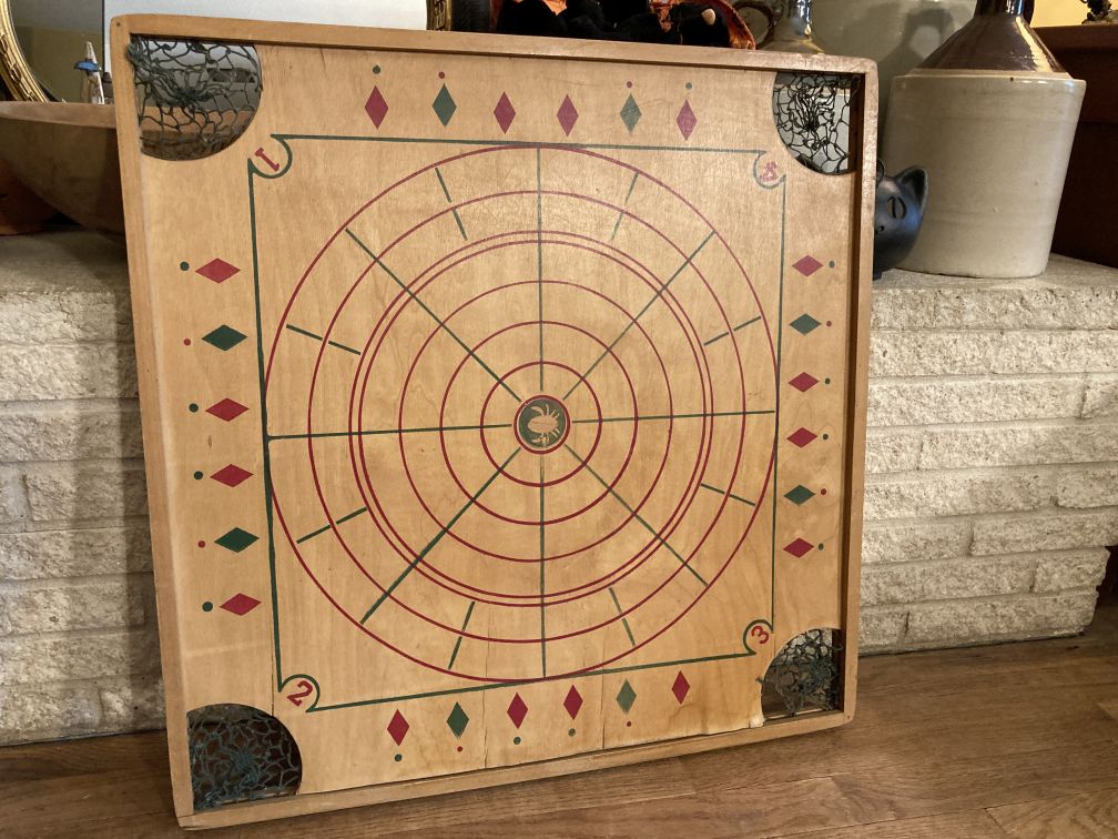 - Two-sided game board with checkerboard on one side, and Crokinole board (with spider center and also known as Spiders and Flies) on the other