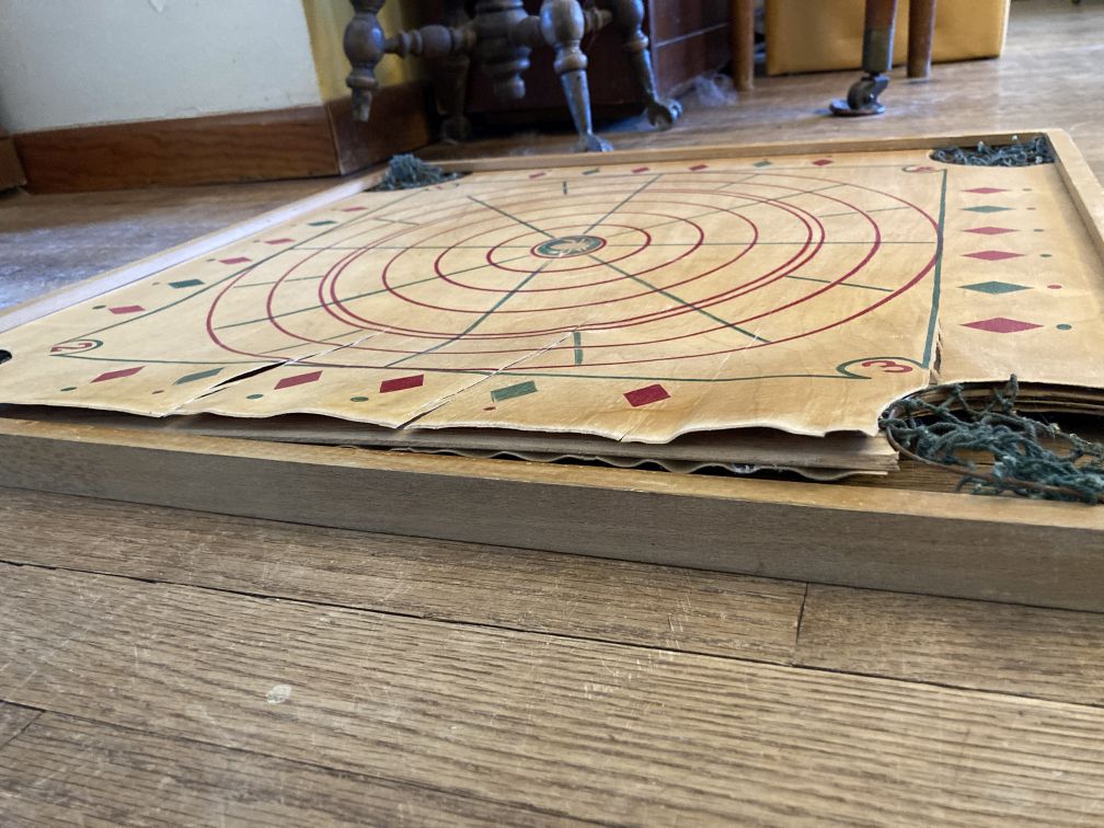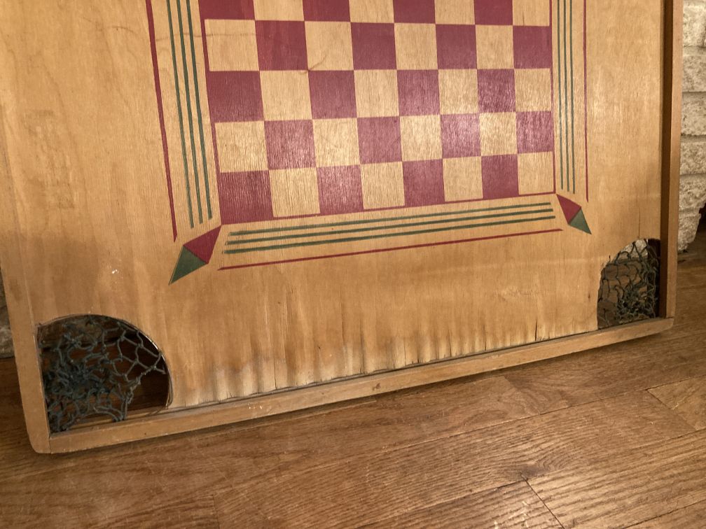 - Vintage or antique game board in fair condition with heavy warp damage - selling AS IS - for display only. Heavy damage to one edge of playing board surface with heavy warping, resulting in veneer splits, cracks, lifting, and separation (SEE PICS); aside from the warping and splits, overall, the rest of the game board is in good condition with finish and surface wear and tear throughout; three pocket nets are in good condition, and one net is misshaped and sprung from veneer with gaps on sides. Selling AS IS--WITH HEAVY DAMAGE - for display or decoration only, and priced accordingly. Antique or vintage game board attributed to Carrom Industries features a checker board on one side and a Crokinole board, also known as Spiders and Flies, on the other. This board has heavy warping and splitting along one whole edge of the playing surface, and therefore is being sold for decoration or display only.