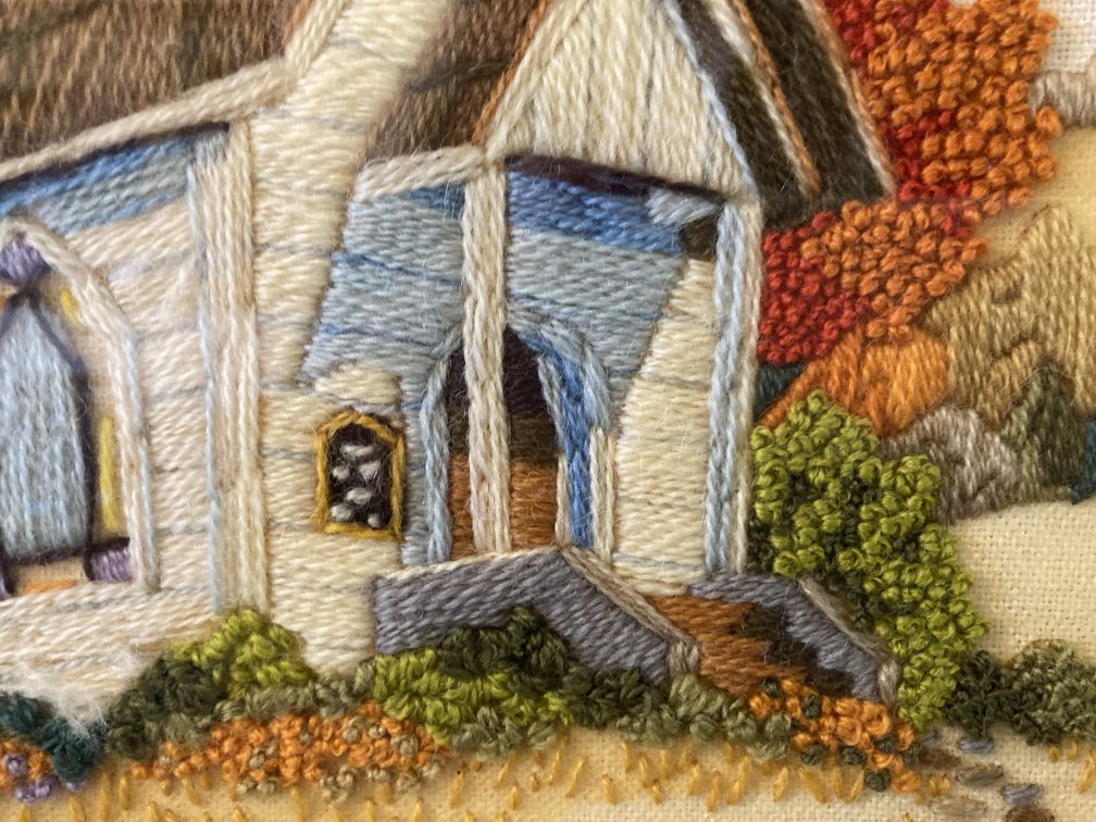 - Needlework picture done in crewel embroidery on linen or cotton, and appears to be from a craft kit