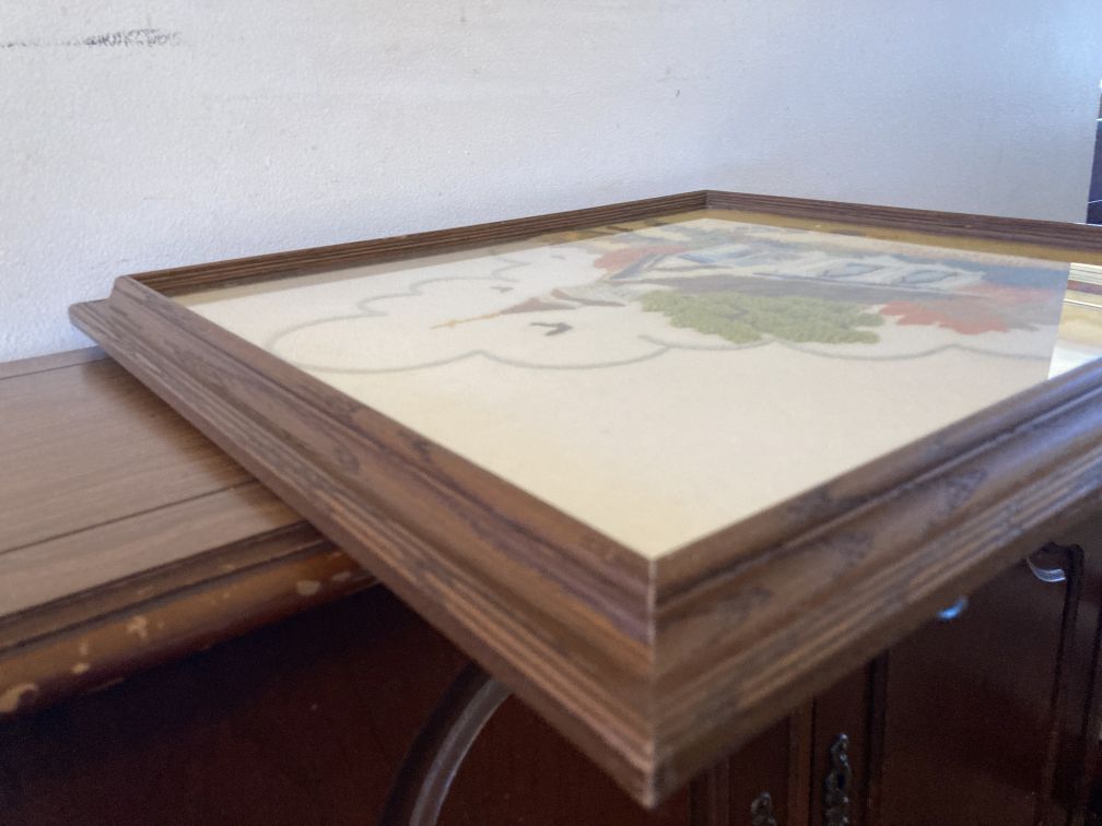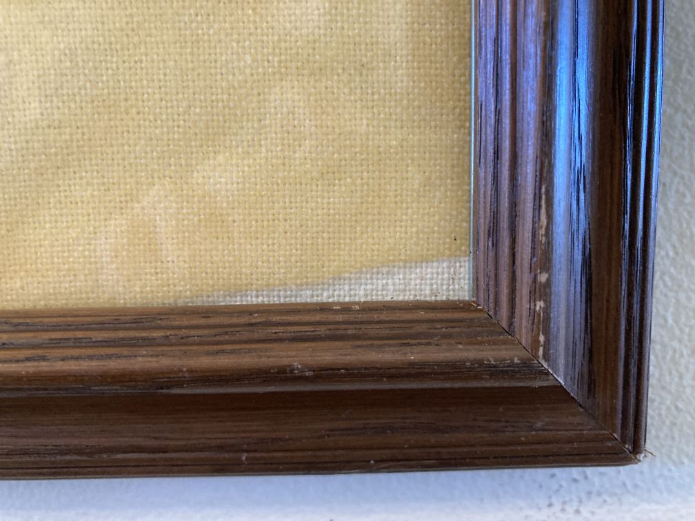 - Vintage framed crewel embroidery picture in very good condition with light wear and tear; paper backing poked and ripped in a few spots; a few nicks and flakes in the wooden frame finish. No damage. Charming framed crewel embroidery piece features an old country church in a serene pastoral setting.