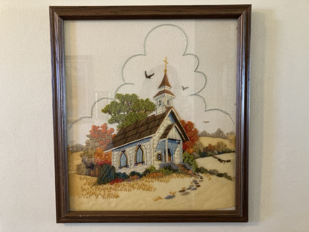 Charming framed crewel embroidery piece features an old country church in a serene pastoral setting.